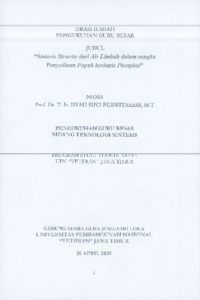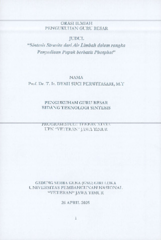 Orasi ilmiah Pengukuhan Guru Besar UPN "Veteran" Jawa Timur : Bidang Teknologi sintesis " Sintesis strutive dari air limbah dalam rangka penyediaan Pupuk berbasis Phosphat"