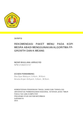 Arrasyid, Nizar Maulana (2025) Rekomendasi Paket Menu Pada Kopi Mesra Abadi Menggunakan Algoritma FP-Growth dan K-Means. Undergraduate thesis, UPN Veteran Jawa Timur.