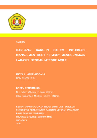 Nugraha, Mirza Khazim (2025) Rancang Bangun Sistem Informasi Manajemen Kost "SIMKO" Menggunakan Laravel dengan Metode Agile. Undergraduate thesis, UPN Veteren Jawa Timur.