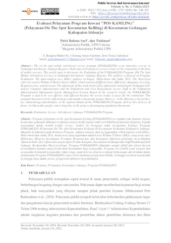 Sari, Putri Rahma (2025) Evaluasi Pelayanan Program Inovasi "POS KAMLING" (Pelayanan On The Spot Kecamatan Keliling) di Kecamatan Gedangan Kabupaten Sidoarjo. Evaluasi Pelayanan Program Inovasi "POS KAMLING" (Pelayanan On The Spot Kecamatan Keliling) di Kecamatan Gedangan Kabupaten Sidoarjo, 6 (1). pp. 284-297. ISSN e-ISSN : 2963-7252; dan p-ISSN : 2797-9083;