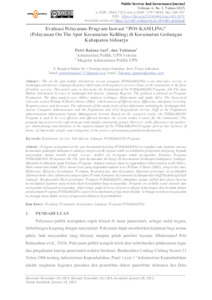 Abstrak : Program pelayanan on the spot kecamatan keliling (POSKAMLING) merupakan satu layanan inovasi kecamatan gedangan kabupaten sidoarjo yang memiliki tujuan untuk mendekatkan pelayanan langsung kepada masyarakat dalam bentuk mobile service. Artikel ini bertujuan untuk mengetahui Evaluasi Program POSKAMLING (Pelayanan On The Spot Kecamatan Keliling) Di Kecamatan Gedangan Kabupaten Sidoarjo. Masalah di fokuskan pada Evaluasi Program. Adapun analisis data menggunakan teknik analisis milik Milles. Hubernman dan Salda 2014. Acuan teori yang digunakan adalah teori William N Dunn (2003), yang terdiri dari Efektivitas, Efisiensi, Kecukupan, Perataan, Responsivitas, dan Ketepatan. Informan penelitian ini melibatkan informan kunci (key informan) yang meliputi Penata Komputer Kecamatan Gedangan dan Staff Disdukcapil Kab Sidoarjo. Berdasarkan Hasil penelitian, Program POSKAMLING dikatakan sangat efektif dan efisien karena menyediakan layanan yang memberikan kemudahan bagi masyarakat. Program ini terbukti tepat sasaran dan memuaskan kelompok masyarakat. Akan tetapi, pada kriteria efisiensi terdapat kekurangan dan kendala dalam pelaksanaan Program POSKAMLING seperti keterlambatan pengiriman blanko. Sehingga membuat masyarakat menunggu lama dalam proses pengurusan dokumen kependudukan. Kata Kunci : Evaluasi, Pelayanan, Kecamatan, Sidoarjo, Program POSKMALING