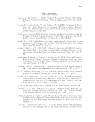 Bunga telang merupakan salah satu sumber pigmen alami yang banyak dimanfaatkan oleh masyarakat sebagai pangan fungsional karena tingginya komponen fitokimia khususnya antosianin. Metode ekstraksi konvensional seperti maserasi kurang optimal dalam mengekstraksi komponen fitokimia, karena waktu yang panjang dan memerlukan energi panas yang berlebihan. Oleh karena itu, penelitian ini bertujuan mengoptimalkan ekstraksi menggunakan Microwave Assisted Extraction (MAE) dengan pelarut aquades-asam tartrat 0,75% untuk menstabilkan antosianin. Tujuannya adalah menentukan kondisi MAE terbaik untuk mengekstrak komponen fitokimia seperti rendemen, antosianin, fenol, flavonoid, dan aktivitas antioksidan (IC50). Selain itu, penelitian ini menguji stabilitas ekstrak pada berbagai pH dan suhu, serta menganalisis perubahan mikrostruktur pigmen sebelum dan sesudah ekstraksi MAE dan maserasi panas. Response Surface Methodology Box Behnken Design (RSM-BBD) digunakan untuk optimasi, dengan variabel rasio pelarut, waktu, dan daya. Penelitian ini juga menggunakan ekstraksi konvensional metode maserasi panas sebagai pembanding. Hasil verifikasi RSM diperoleh kondisi optimal dengan rasio pelarut 1:15 (g/mL), waktu 9 menit, dan daya 360 watt, menghasilkan rendemen 54,10%, antosianin 40,07 mg/L, fenol 378,618 mgGAE/g, flavonoid 66,81 mgQE/g, dan IC50 11,491 ppm. Stabilitas pigmen terbukti lebih stabil pada pH 1-5 dan suhu 40-60°C, namun menurun pada pH ≥5 dan suhu ≥80°C. Analisis SEM menunjukkan deformasi struktural yang lebih signifikan pada ekstrak MAE dibandingkan maserasi panas, dengan retakan dan permukaan kasar.