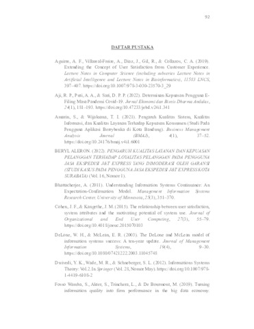 ALISSA AZIZAH HERMAN SUSILO, IMPACT OF SYSTEM QUALITY ON USER SATISFACTION IN DJP ONLINE: A STUDY OF REGISTERED TAXPAYERS AT KPP PRATAMA JOMBANG. Sistem informasi yang terstruktur dengan baik memainkan peran penting dalam meningkatkan efisiensi layanan perpajakan digital. Di Indonesia, Direktorat Jenderal Pajak (DJP) mengembangkan DJP Online untuk memfasilitasi proses pelaporan dan pembayaran pajak. Namun, kepuasan pengguna terhadap platform ini masih menjadi perhatian utama, yang dipengaruhi terutama oleh kualitas sistem dan kualitas informasi. Penelitian ini bertujuan untuk mengkaji pengaruh kualitas sistem terhadap kepuasan pengguna DJP Online, dengan fokus pada Wajib Pajak yang terdaftar di KPP Pratama Jombang. Menggunakan pendekatan kuantitatif, data dikumpulkan melalui kuesioner terstruktur dari 100 responden yang dipilih menggunakan rumus Slovin. Data dianalisis menggunakan analisis regresi linier berganda, serta uji validitas dan reliabilitas untuk memastikan konsistensi data. Hasil penelitian menunjukkan bahwa kualitas sistem berpengaruh signifikan terhadap kepuasan pengguna (R² = 0,67, p < 0,05), dengan faktor-faktor utama meliputi keandalan sistem, kemudahan penggunaan, dan kecepatan respon. Namun, beberapa wajib pajak melaporkan adanya kendala akses sistem saat periode puncak. Temuan ini menyoroti pentingnya peningkatan kinerja sistem untuk mendukung kepatuhan pajak. Penelitian selanjutnya disarankan untuk mengeksplorasi variabel tambahan seperti kualitas informasi, kepercayaan, dan persepsi kemanfaatan guna memberikan analisis yang lebih komprehensif terkait kepuasan wajib pajak terhadap layanan perpajakan digital.