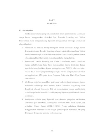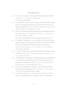 Bunga merupakan struktur reproduksi pada tumbuhan yang berfungsi dalam proses penyerbukan dan pembuahan. Beberapa jenis bunga memiliki kemiripan dalam bentuk dan warna, meskipun berasal dari spesies yang berbeda. Oleh karena itu, proses klasifikasi secara manual menjadi sulit, sedangkan setiap bunga memiliki manfaat medis yang berbeda-beda. Maka, penelitian ini mengusulkan kombinasi model Transfer Learning dan Vision Transformer (TLMViT) sebagai ekstraksi fitur mendalam, serta Multilayer Perceptron (MLP) untuk klasifikasi bunga herbal. Penelitian ini mencakup enam tahap: (1) akuisisi data, (2) pengubahan ukuran citra, (3) ekstraksi fitur menggunakan Transfer Learning dan Vision Transformer, (4) pembagian data, (5) klasifikasi menggunakan MLP, dan (6) evaluasi model. Dataset ini terdiri dari 4.100 gambar yang mencakup lima jenis bunga herbal, yaitu Black-Eyed Susan, Calendula, Common Daisy, Coreopsis, dan Sunflower. Hasil menunjukkan akurasi tertinggi 78.29% dengan loss 0.6162 didapatkan dari pembagian data 90:10, learning rate 0.0001, batch size 64, dan arsitektur 3-layer MLP. Evaluasi kinerja model menunjukkan bahwa rata-rata metrik precision, recall, dan f1-score yang diperoleh adalah 78%. Prediksi terbaik model terjadi pada kelas Common Daisy sebesar 87% dan Black Eyed Susan 84%. Hasil penelitian ini menunjukkan bahwa model cukup baik dalam mengklasifikasikan bunga herbal, terutama yang memiliki kemiripan visual, dengan memanfaatkan ekstraksi fitur mendalam.