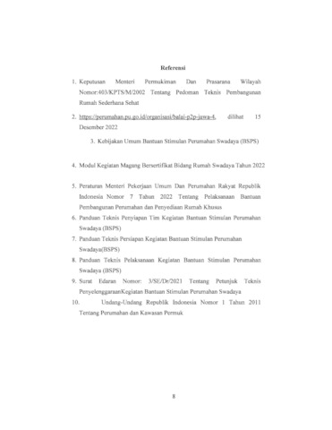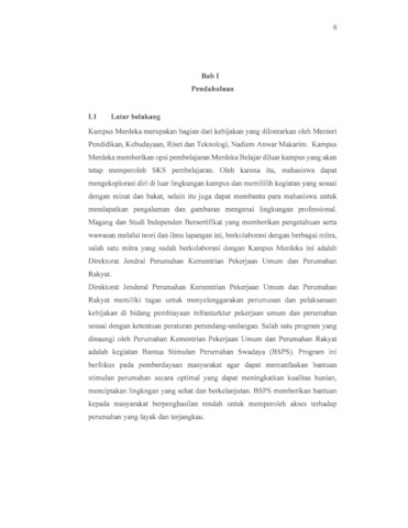 Salah satu dari banyaknya program di Kampus Merdeka adalah Magang dan Studi Independen Bersertifikat. Program yang diselenggarakan oleh Menteri Pendidikan dan Kebudayaan, Nadiem Anwar Makarim, B.A., M.B.A ini memberikan hak dan kesempatan bagi mahasiswa untuk mengambil mata kuliah dan berkegiatan di luar program studi dan perguruan tinggi selama kurang lebih lima bulan. Selain itu, mahasiswa juga dapat berbagai ilmu yang berguna untuk beradaptasi dan memasuki dunia kerja. Salah satu mitra yang bekerja sama dengan Kampus Merdeka adalah Direktorat Jenderal Perumahan Pekerjaan Umum dan Perumahan Rakyat Jawa Timur. Bantuan Stimulan Perumahan Swadaya merupakan program dari Ditjen Perumahan PUPR. Program ini secara menyeluruh berfokus kepada masyarakat untuk dapat memanfaatkan bantuan stimulant perumahan secara optima dan meningkatkan kualitas dan kennyamanan rumah sesuai dengan standart agar tercipta lingkungan yang sehat, aman dan berkelanjutan. BSPS atau bisa dikena sebagai “bedah rumah” ini merupakan bantuan yang diberikan oleh pemerintah berupa stimulant bagi masyarakat berpenghasilan rendah serta meningkatkan keswadayaan dalam pembangunan kualitas suatu rumah yang meliputi prasarana, sarana, dan utilitas umum. Menurut Undang-Undang Nomor 1 Tahun 2011 tentang Perumahan dan Kawasan Permukiman mengamatkan bahwa negara bertanggung jawab melindungi segenap bangsa Indonesia melalui penyelenggaraan perumahan dan kawasan permukiman agar masyarakat mampu bertempat tinggal serta menghuni rumah yang layak dan terjangkau di dalam lingkungan yang sehat, aman, harmonis, dan berkelanjutan di seluruh wilayah Indonesia. Pada kegiatan ini penulis ditugaskan sebagai arsitek pendamping fasilitator teknik yang dimana menjalankan tugas seperti menilai kerusakan rumah, pengawasan pembangunan rumah, dan memfasilitasi penyusunan rencana perbaikan rumah.
