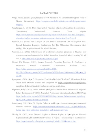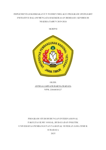 Daeng Mafata, Annisa Cahyani (2025) IMPLEMENTASI KEBIJAKAN UN WOMEN MELALUI PROGRAM SPOTLIGHT INITIATIVE DALAM MENGATASI KEKERASAN BERBASIS GENDER DI NIGERIA TAHUN 2019-2024. Undergraduate thesis, UPN Veteran Jawa Timur.