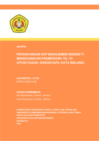Uyun, Khurrotul (2025) PERANCANGAN SOP MANAJEMEN INSIDEN TI MENGGUNAKAN FRAMEWORK ITIL V3 (STUDI KASUS: DISDUKCAPIL KOTA MALANG). Undergraduate thesis, UPN Veteran Jawa Timur.