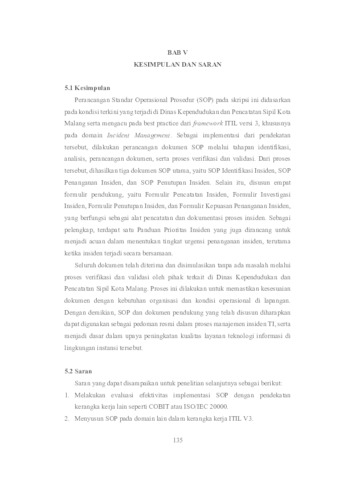 The development of information technology encourages the government to improve public services through electronic-based government systems. The Population and Civil Registration Office of Malang City has implemented various information systems, such as SIAPEL-TEGAS and Lapor Pak, but still often experiences IT incidents that disrupt services. Based on internal data, 83 IT incidents were recorded during the period 2022-2024, with around 65% of them classified as moderate to high and impacting more than one service unit. Currently, Population and Civil Registration Office of Malang City does not have a systematic Standard Operating Procedure (SOP) for handling IT incidents, so an ITIL V3-based SOP design is needed. This thesis aims to design an IT Incident Management SOP that complies with ITIL V3 principles to handle incidents quickly, precisely and consistently. The methods used include data collection through literature studies and interviews, gap analysis between existing conditions and ideal conditions, and designing SOP documents that are tested through a verification and validation process. The results of this thesis are in the form of three main SOP documents, namely the Incident Identification, Handling, and Closing SOPs, along with four supporting forms and one incident prioritization guide. All documents have been verified and validated so that they can be used as official guidelines in the IT Incident Management process at Population and Civil Registration Office of Malang City.