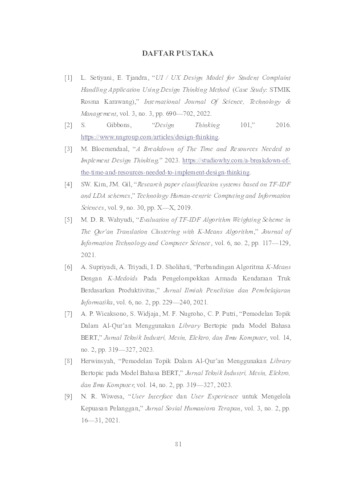 Dalam framework design thinking, tahap empathize dan define merupakan bagian dari proses User Experience (UX) research yang bertujuan untuk menganalisis pain points pengguna melalui data kualitatif. Namun, proses tersebut selalu dilakukan secara manual, sehingga membutuhkan sumber daya dan waktu yang lebih. Penelitian ini mengembangkan sistem klasterisasi berbasis unsupervised machine learning untuk menganalisis data kualitatif berdasarkan topik pain points-nya menggunakan algoritma K-Means. Sebagai objek penelitian, digunakan data ulasan pengguna aplikasi Gojek versi 4.9.0, 4.9.1, dan 4.9.3 (November 2021 hingga Januari 2024). Proses text preprocessing dilakukan menggunakan pendekatan Natural Language Processing (NLP) dengan pustaka NLTK Sistem diuji dengan variasi parameter jumlah klaster dan reduksi komponen Principal Component Analysis (PCA). Evaluasi hasil klasterisasi dilakukan menggunakan silhouette score, Davies-Bouldin Index, dan Calinski-Harabasz Index. Hasil terbaik diperoleh pada jumlah klaster sebanyak 8 dengan silhouette score sebesar 0.6512, Davies-Bouldin Index sebesar 1.0818, Calinsiki-Harabasz Index sebesar 4.9126. Rata-rata waktu komputasi yang dibutuhkan sistem tercatat selama 7.85 detik. Hasil ini menunjukkan bahwa sistem cukup efektif dalam mengelompokkan data kualitatif berdasarkan pola pain points. Sistem yang dikembangkan dapat dimanfaatkan oleh UX researcher untuk analisis data secara otomatis dan efisien