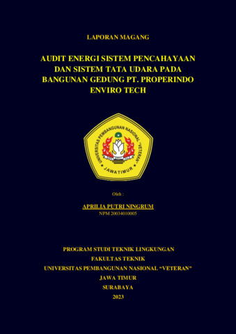 Ningrum, Aprilia Putri (2023) Audit Energi Sistem Pencahayaan dan Sistem Tata Udara pada Bangunan Gedung PT. Properindo Enviro Tech. Project Report (Praktek Kerja Lapang dan Magang). Universitas Pembangunan Nasional "Veteran" Jawa Timur, Surabaya, Indonesia. (Unpublished)