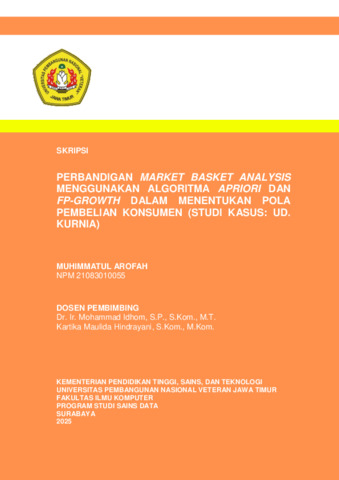 Arofah, Muhimmatul (2025) Perbandingan Market Basket Analysis Menggunakan Algoritma Apriori dan FP-Growth dalam Menentukan Pola Pembelian Konsumen (Studi Kasus: UD. Kurnia). Undergraduate thesis, Universitas Pembangunan Nasional Veteran Jawa Timur.