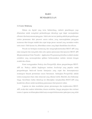 In today’s digital era, the aviation industry faces increasingly complex challenges in delivering fast, efficient, and easily accessible services to customers. As the number of airline passengers rises each year, the need for a reliable and user‑friendly ticket‑booking system becomes ever more critical. Information technology—particularly web‑based system development—plays a key role in meeting this demand. One widely adopted approach is the use of REST APIs, which enable easier and more efficient system integration and communication. A REST API (Representational State Transfer – Application Programming Interface) is one of the most popular architectures for developing web and mobile applications. By leveraging HTTP requests, a REST API allows data to be accessed and manipulated in a flexible and scalable manner. Node.js, a JavaScript runtime environment, offers high performance with non‑blocking I/O operations, making it well‑suited to REST‑API development. Meanwhile, PostgreSQL is renowned as a robust relational database management system capable of handling a broad range of transactions securely and efficiently. This Industrial Placement Report examines the design and development of a REST API for an airline ticket‑booking system using Node.js and PostgreSQL. The project aims to create an efficient and effective solution for online ticket management, delivering an optimal user experience through rapid data processing, high accessibility, and strong system stability. The report includes a literature review covering information systems, system design, JavaScript, Node.js, PostgreSQL, Prisma, APIs, and REST. The implementation process encompasses requirements analysis, system design, and the development of core features such as user registration and authentication, flight‑schedule search, ticket booking, user‑profile management, payments, and information related to airlines and airports. Additional features—such as notifications and integration with third‑party services (e.g., Google Auth)—are also included to enhance convenience and the overall user experience. Implementation results demonstrate that the online airline ticket‑booking system can operate efficiently and reliably, meeting overall system requirements while delivering an optimal user experience. The project’s benefits include practical experience in the information‑technology industry. Support from various parties—including the university, academic supervisors, and family—played a significant role in the successful completion of this industrial placement project.