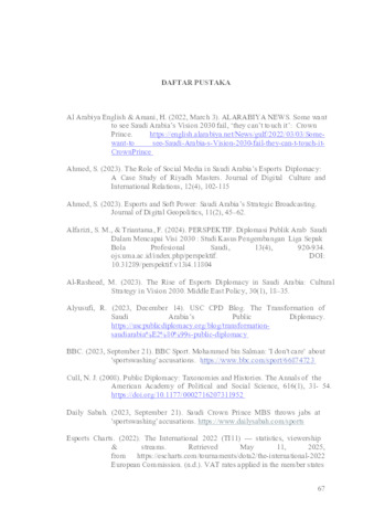 Abstract This paper seeks to answer the question: How does the Riyadh Masters tournament function as part of Saudi Arabia’s public diplomacy agenda? The discussion focuses on how Saudi Arabia utilizes the Riyadh Masters—a Dota 2 tournament that forms part of the larger Esports World Cup (EWC)—as a strategic move to support the broader goals of Saudi Vision 2030. First launched in 2022, the event not only places Saudi Arabia on the competitive Dota 2 map but also creates economic opportunities through foreign investment, tourism, and international partnerships. The tournament is examined through the lens of public diplomacy practices using a qualitative method, drawing from academic journals, factual news reports, and official government statements. The analysis is grounded in Nicholas J. Cull’s (2008) public diplomacy framework to evaluate how the Saudi government uses events like the Riyadh Masters to promote openness and engagement with the international community. This study argues that the 2022–2023 Riyadh Masters represents a deliberate public diplomacy initiative by the Saudi government. Keywords: Public Diplomacy, Riyadh Masters, Saudi Vision, Esports Diplomacy