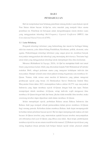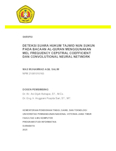 Mas, Muhammad Aqil Salim (2025) DETEKSI SUARA HUKUM TAJWID NUN SUKUN PADA BACAAN AL-QURAN MENGGUNAKAN MEL FREQUENCY CEPSTRAL COEFFICIENT DAN CONVOLUTIONAL NEURAL NETWORK. Diploma thesis, UPN "Veteran" Jawa Timur.