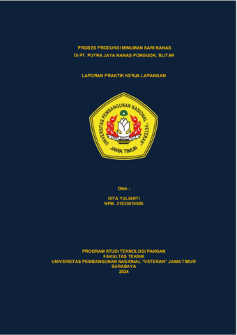 YULIARTI, DITA (2025) PROSES PRODUKSI MINUMAN SARI NANAS DI PT. PUTRA JAYA NANAS, PONGGOK, BLITAR. Project Report (Praktek Kerja Lapang dan Magang). UPN "Veteran" Jawa Timur. (Unpublished)