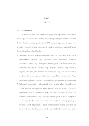 ABSTRACT YOVI ARIF ZACHARY. 18041010077. SOAR ANALYSIS IN THE DEVELOPMENT STRATEGY OF THE WIRA-WIRI FEEDER PROGRAM IN SURABAYA CITY This study aims to analyze the development strategy of the Wira-Wiri Feeder Program in Surabaya City using the SOAR (Strengths, Opportunities, Aspirations, Results) approach. The background of this research is based on the chronic congestion problem in Surabaya City and the low accessibility of public transportation to residential areas and community activity centers. The Wira-Wiri Feeder Program comes as a feeder transportation solution that reaches narrow streets and is integrated with other public transportation systems such as Suroboyo Bus. This research method uses a descriptive qualitative approach with data collection techniques through interviews, observation, and documentation. The results showed that the main strengths of this program lie in accessibility and system integration, opportunities in the form of community enthusiasm and policy support, aspirations to expand service coverage, and the results achieved in increasing the number of public transportation users. However, there are still challenges such as limited budget, fleet, and public preference for private vehicles. Through SOAR analysis, this research recommends strengthening strategies based on internal advantages and external opportunities to realize a sustainable transportation system in Surabaya. Keywords: Strategy, Feeder Wira-Wiri, SOAR, Public Transportation