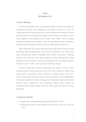 Penelitian ini difokuskan pada analisis dan prediksi tren volume lalu lintas di jalan tol Surabaya–Gempol menggunakan analisis time series. Dataset dikumpulkan dari PT Jasamarga Transjawa Tol dan mencakup data volume kendaraan di berbagai gerbang tol dari tahun 2020 hingga 2023. Penelitian ini melibatkan beberapa tahap penting, termasuk pengumpulan data, pra-pemrosesan data, analisis data eksploratif (EDA), dan pemodelan. Proses pemodelan dipatok oleh variabel "Gerbang Tol" yang mewakili kategori kendaraan. Evaluasi kinerja model dilakukan dengan menggunakan metrik Mean Absolute Percentage Error (MAPE) untuk memberikan wawasan tentang akurasi prediksi. Hasil penelitian ini memberikan informasi yang berharga bagi pengelola tol dan perencanaan infrastruktur, serta membantu dalam pengambilan keputusan yang lebih baik dan alokasi sumber daya yang lebih tepat.