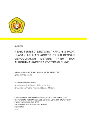 Suryono, Muhammad Nur Rachman Nidhi (2025) ASPECT-BASED SENTIMENT ANALYSIS PADA ULASAN APLIKASI ACCESS BY KAI DENGAN MENGGUNAKAN METODE TF-IDF DAN ALGORITMA SUPPORT VECTOR MACHINE. Undergraduate thesis, UPN Veteran Jawa Timur.