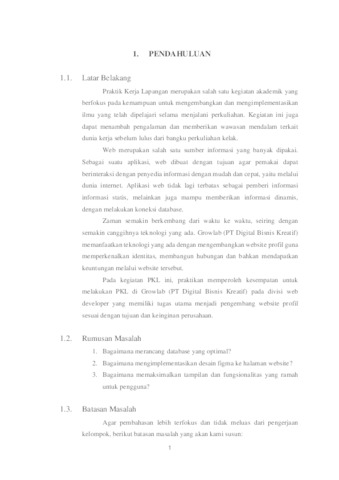 Laporan ini membahas pengembangan website profil untuk Growlab, sebuah divisi dari PT Digital Bisnis Kreatif. Growlab merupakan entitas yang berfokus pada pengembangan inovasi dan pertumbuhan bisnis UMKM melalui pendekatan kreatif di dunia digital. Penelitian ini bertujuan untuk merancang dan mengimplementasikan perubahan pada website profil Growlab guna meningkatkan visibilitas, interaktivitas, dan kegunaan bagi pengguna. Metode pengembangan yang digunakan mencakup analisis kebutuhan pengguna, evaluasi tata letak, dan perancangan antarmuka yang responsif. Proses pengembangan dilakukan secara iteratif untuk memastikan responsivitas dan kepuasan pengguna. Penekanan diberikan pada pembaruan konten yang informatif dan menarik, serta integrasi fitur interaktif seperti formulir kontak dan navigasi yang lebih intuitif. Hasil dari penelitian ini menunjukkan perubahan signifikan pada desain dan fungsionalitas website Growlab. Pembaruan ini diharapkan dapat meningkatkan pengalaman pengguna, menarik lebih banyak perhatian dari audiens potensial, serta memperkuat citra Growlab sebagai pemimpin inovasi di bidang digital. Implikasi dan rekomendasi untuk pengembangan di masa mendatang juga dibahas dalam laporan ini.