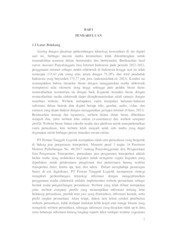 Seiring dengan pesatnya perkembangan teknologi komunikasi di era digital saat ini, berbagai jenis media komunikasi telah dikembangkan untuk memudahkan manusia dalam berinteraksi dan bertransaksi. Berdasarkan hasil survei Asosiasi Penyelenggara Jasa Internet Indonesia periode 2022-2023, penggunaan internet sebagai media elektronik di Indonesia kini mencapai 215,63 juta jiwa atau setara dengan 78,19% dari total penduduk Indonesia yang berjumlah 275,77 juta jiwa. Kondisi ini menunjukkan bahwa transaksi bisnis dengan menggunakan media elektronik memiliki nilai ekonomi yang tinggi sehingga para pelaku bisnis harus memanfaatkan momentum ini dengan baik. Kegiatan transaksi bisnis dengan menggunakan media elektronik dapat dilaksanakan salah satunya dengan pembuatan website. Berdasarkan konsep dan tujuannya, website dalam dunia bisnis dibedakan menjadi dua, yaitu website toko online dan website company profile. PT Firman Tangguh Logistik merupakan perusahaan yang bergerak di bidang jasa manajemen transportasi. Dalam menghadapi persaingan bisnis di era digitalisasi, PT Firman Tangguh Logistik mempunyai strategi mengikuti perkembangan teknologi informasi dengan mengoptimalkan penggunaan media elektronik melalui penerapan website perusahaan sebagai bentuk upaya pengembangan perusahaan. Namun dalam waktu satu tahun setelah pembuatan website perusahaan, tidak ada tindakan lebih lanjut atau staf khusus yang mengelola website perusahaan, sehingga informasi yang disajikan tidak up to date, serta beberapa informasi kurang lengkap seperti tidak terdapat struktur organisasi dan tujuan pada halaman profil perusahaan, detail produk hanya terdapat pada gambar sehingga spesifikasi produk tidak jelas, tidak terdapat link media sosial perusahaan yang terhubung langsung dari website sehingga pengunjung harus keluar dari situs jika ingin mencari informasi lebih lanjut. Selain itu, tidak terdapat menu galeri dan tidak terdapat kolom pencarian di website.. Oleh karena itu penelitian ini dilakukan untuk mengimplementasikan proses pengembangan website company profile yang telah dibangun dengan menampilkan informasi yang lebih detail, dan terupdate sehingga tampilan profil lebih menarik dan profesional