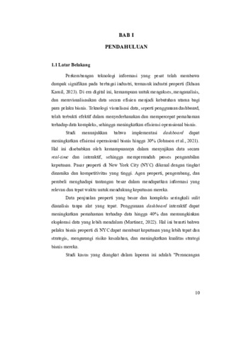 Perkembangan teknologi informasi yang pesat telah memberikan dampak signifikan terhadap berbagai industri, termasuk industri properti. Kemampuan untuk mengakses, menganalisis, dan memvisualisasikan data secara efisien menjadi kebutuhan utama bagi para pelaku bisnis. Dalam konteks ini, dashboard sebagai alat visualisasi data terbukti efektif dalam menyederhanakan pemahaman atas data kompleks dan meningkatkan efisiensi operasional. Penelitian ini bertujuan merancang dashboard penjualan properti di New York City (NYC) menggunakan framework Looker Studio guna mengatasi tantangan dalam pengelolaan data penjualan yang besar dan tersebar. Dashboard yang dikembangkan menyediakan fitur integrasi dengan berbagai sumber data seperti situs web, media sosial, platform iklan, dan basis data internal, sehingga memungkinkan visualisasi terpadu dalam satu platform. Visualisasi interaktif yang ditawarkan membantu pengguna mengidentifikasi tren dan pola penjualan secara cepat, serta memberikan fleksibilitas untuk eksplorasi data secara mendalam. Akses data secara real-time juga mendukung respons cepat terhadap dinamika pasar. Fitur-fitur tambahan seperti filter interaktif, kustomisasi tampilan, laporan otomatis, dan notifikasi berbasis data semakin memperkuat kemampuan dashboard dalam mendukung pengambilan keputusan yang proaktif. Pengujian melibatkan agen properti dan manajer penjualan di NYC, yang memberikan masukan untuk menyempurnakan desain dan fungsionalitas dashboard agar tetap user-friendly, bahkan bagi pengguna dengan keterampilan teknis terbatas. Hasilnya menunjukkan bahwa dashboard ini efektif mengatasi masalah fragmentasi data, meningkatkan efisiensi kerja, dan mengurangi risiko kesalahan dalam pelaporan. Secara keseluruhan, implementasi Looker Studio dalam dashboard penjualan properti menunjukkan kontribusi positif terhadap transformasi digital di sektor properti. Solusi ini memberikan keunggulan kompetitif melalui efisiensi operasional yang lebih tinggi dan pengambilan keputusan yang lebih informasi. Pengembangan lanjutan dashboard diharapkan mampu menjawab kebutuhan industri properti yang terus berkembang serta membuka peluang baru dalam inovasi layanan pelanggan.
