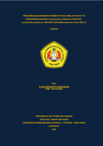 Anggraeni, Citra Dwi Wahyu (2025) Pengembangan Minuman Probiotik Nira Siwalan Ready To Drink Menggunakan Lactobacillus acidophilus FNCC0051, Lactobacillus plantarum FNCC0027 dan Bifidobacterium breve BRL131. Undergraduate thesis, UPN Veteran Jawa Timur.