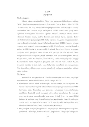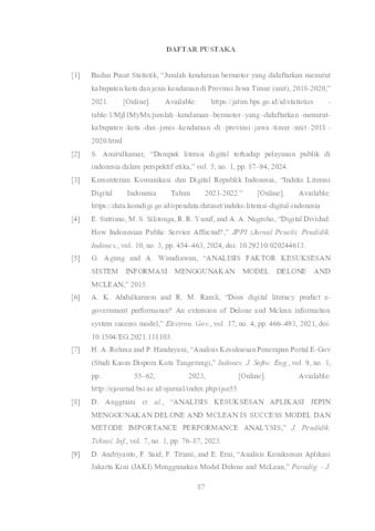 The city of Surabaya is facing various challenges, one of which is traffic congestion. As a solution to this problem, the Surabaya City Government launched the Suroboyo Bus service as an alternative form of public transportation. To support this service, the government also introduced the GOBIS Suroboyo application as a form of egovernment implementation to improve the effectiveness of public transportation use. This app offers various features, such as real-time bus movement monitoring, departure schedule information, travel routes, and distances between stops. This thesis analyzes the success factors of the GOBIS Suroboyo app using the modified ISSM Delone & McLean model, which includes the addition of the Digital Literacy variable. The analysis was conducted using the PLS-SEM method with the assistance of SmartPLS 3 software. The research sample consisted of 402 respondents who were users of the GOBIS Suroboyo app. The results of this thesis indicate that information quality, service quality, system quality, and digital literacy have a positive impact on user satisfaction. Additionally, information quality and digital literacy also influence how frequently the app is used. Digital literacy, app usage levels, and user satisfaction collectively have a positive impact on perceived benefits, meaning the app successfully enhances the performance of e-government services in the public transportation sector