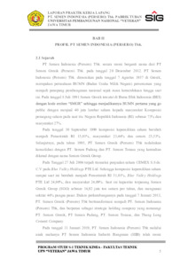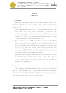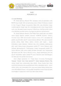 PT. Semen Indonesia (Persero) Tbk. Pabrik Tuban adalah salah satu industri semen dengan kapasitas produksi mencapai 14.000.000 ton/tahun. Ordinary Portland Cement (OPC) dan Portland Composite Cement (PCC) merupakan tipe produk yang dihasilkan oleh PT. Semen Indonesia (Persero) Tbk. semen memiliki peranan penting dalam bidang industry terutama pada negara – negara berkembang seperti Indonesia. Indonesia akan terus melakukan pembangunan pada segala bidang dengan menggunakan produk PT. Semen Indonesia pada beberapa pembangunannya. Pembangunan dengan menggunakan produk PT. Semen Indonesia salah satunya adalah Jembatan Suramadu yang menggunakan tipe khusus yaitu SBC (Special Blended Cement), dengan keberhasilan salah satu proyek membuktikan bahwa produk PT Semen Indonesia dapat diperhitungkan dan tidak kalah dari produk semen lainnya.