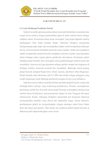 Pabrik Propil Bromida dari Asam Bromida dan Propanol Melalui Proses Hidrobrominasi dengan Katalis Asam Sulfat
