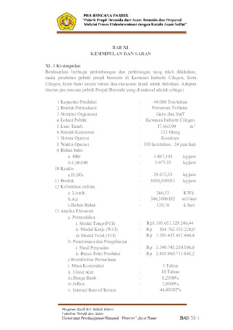 The Propyl Bromide plant is planned to be established in the Cilegon Industrial Area, Cilegon City, West Java, as a Limited Liability Company (PT) with a line and staff organizational structure. The production process uses hydrobromic acid (HBr) and propanol (C₃H₇OH) as the main raw materials, with sulfuric acid (H₂SO₄) as a catalyst. The reaction proceeds continuously for 24 hours a day and 330 days a year at a temperature of 80°C and atmospheric pressure in a Continuous Stirred Tank Reactor (CSTR). The plant is designed to produce 40,000 tons of Propyl Bromide (C₃H₇Br) annually. The utility requirements include 351.94 kWh of electricity, 341.63 m³/day of water, and 122.65 L/day of fuel. The plant will be built on a land area of 17,631 m² and is expected to employ 232 workers. From an economic standpoint, the Total Capital Investment (TCI) required is estimated at IDR 1,298,088,558,729.50, comprising a Fixed Capital Investment (FCI) of IDR 1,103,375,274,920.10 and a Working Capital Investment (WCI) of IDR 194,713,283,809.40. The projected annual revenue is IDR 3,341,045,208,969.70, with total production costs amounting to IDR 2,498,494,332,385.20. Financial analysis indicates an Internal Rate of Return (IRR) of 44.49%, a pre-tax Return on Investment (ROI) of 56%, and a post-tax ROI of 44%, with a payback period of 3 years and 5 months and a Break-Even Point (BEP) of 32.31%. Based on these technical and financial evaluations, the establishment of the Propyl Bromide plant is deemed feasible and highly profitable, capable of meeting both domestic and export market demands.