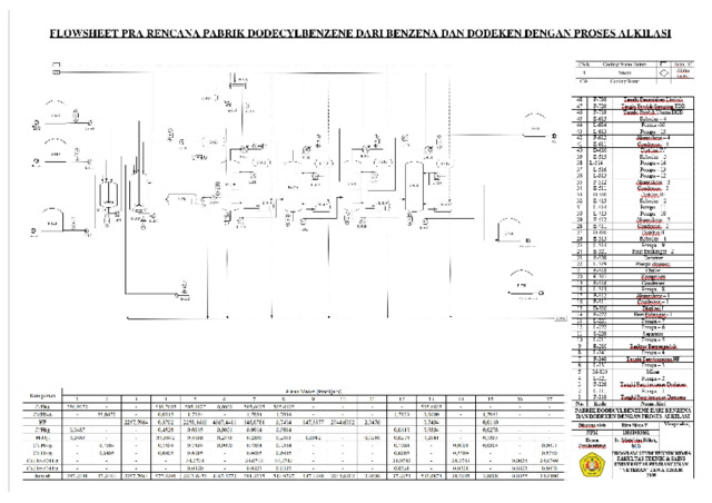 Perencanaan Pabrik Dodecylbenzene akan didirikan di daerah Cilacap, Jawa Tengah dengan pertimbangan lokasi yang dekat dengan pelabuhan. sehingga dapat memudahkan dalam transportasi bahan baku dan pendistribusian produk. Dari hasil perhitungan dan pembahasan, dapat disimpulkan sebagai berikut. Kapasitas produksi : 70.000 ton/tahun. Bahan yang digunakan : Benzena dan Dodeken. Sistem operasi : Continue. Waktu operasi : 330 hari/tahun; 24 jam/hari. Jumlah karyawan : 110 orang. Bentuk perusahaan : Perseroan Terbatas (PT). Struktur organisasi : Garis dan staff Analisa Ekonomi :Masa konstruksi : 3 tahun. Umur pabrik : 10 tahun. Fixed Capital Investment (FCI) : Rp 759.501.082.131. Working Capital Investment (WCI) : Rp. 2.353.133.095.478. Total Capital Investment (TCI) : Rp 3.112.634.177.609. Biaya bahan baku (tiap tahun) : Rp. 8.321.263.612.085. Biaya utilitas (tiap tahun) : Rp. 2.419.104.417. Biaya produksi total (TPC) : Rp. 9.574.087.945.294. Hasil penjualan produk : Rp. 11.389.000.000.000. Bunga bank : 10,75%. Internal Rate of Return : 25%. Pay Back Periode (PBP) : 3 tahun 1 bulan. Break Even Point (BEP) : 33%