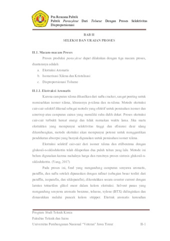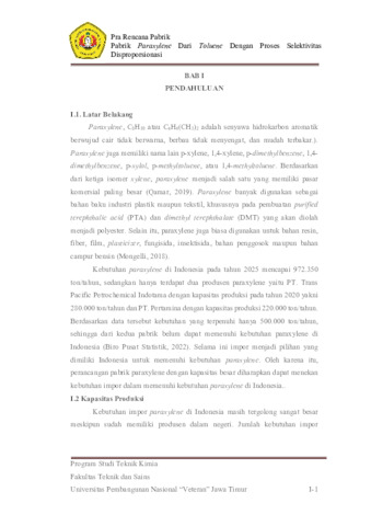 Pabrik Paraxylene Dari Toluene Dengan Proses Selektivitas Disproporsionasi Kapasitas 50.000 Ton/Tahun