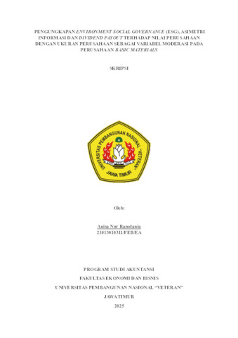Ramdania, Anisa Nur (2025) Pengungkapan Environment Social Governance (ESG), Asimetri Informasi Dan Dividend Payout Terhadap Nilai Perusahaan Dengan Ukuran Perusahaan Sebagai Variabel Moderasi Pada Perusahaan Basic Materials. Undergraduate thesis, UPN "Veteran" Jawa Timur.