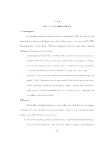 Turnover intention, or the intention of employees to leave the company, is one of the serious challenges in human resource management, including in the banking sector. PT BPR Nusumma Jawa Timur Kantor Wilayah Kabupaten Jombang has experienced an increasing turnover rate every year, especially in 2024, which reached 12.5%, exceeding the ideal limit of 10%. This issue is believed to be related to leadership aspects and employee job satisfaction. This study aims to analyze the influence of leadership and job satisfaction on turnover intention within the company. This study uses a quantitative method with a survey technique using a questionnaire administered to the entire population of 38 permanent employees using a saturated sampling technique. Data analysis was conducted using the Partial Least Square (PLS) method. The results of the study indicate that leadership has a significant influence on turnover intention, meaning that the better the quality of leadership, the lower the employees' intention to leave the company. Additionally, job satisfaction was also found to have a negative and significant influence on turnover intention, indicating that high levels of job satisfaction can reduce employees' desire to quit their jobs. This study recommends that the company improve leadership quality and pay attention to job satisfaction factors to reduce employee turnover intention.