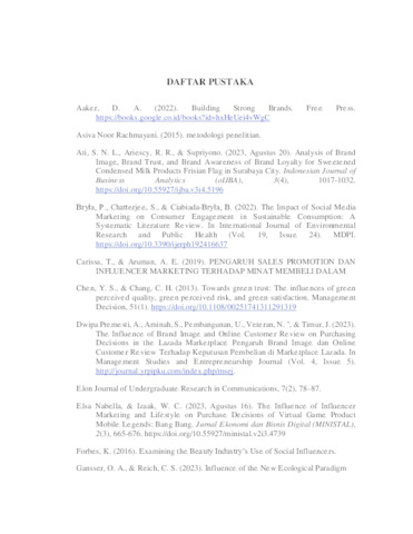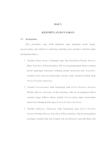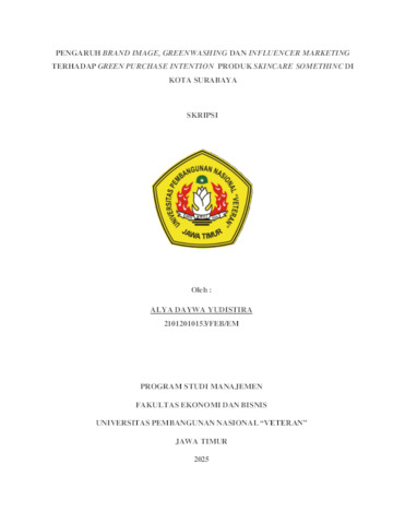YUDISTIRA, ALYA DAYWA (2025) PENGARUH BRAND IMAGE, GREENWASHING, DAN INFLUENCER MARKETING TERHADAP GREEN PURCHASE INTENTION PRODUK SKINCARE SOMETHINC DI KOTA SURABAYA. Undergraduate thesis, UPN VETERAN JAWA TIMUR.