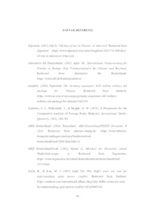 Perang Rusia-Ukraina yang terjadi sejak Februari 2022 masih menjadi topik pembahasan yang hangat dalam diskursus Geopolitik Eropa Timur. Setelah berhasil menganeksasi Krimea pada 2014, Rusia melancarkan ‘Operasi Militer Khusus’ ke teritori Ukraina yang memiliki kekuatan militer jauh di bawahnya. Hingga saat ini, Angkatan Bersenjata Ukraina masih bertahan melawan invasi Rusia berkat berbagai bantuan militer yang dikirimkan oleh Barat. Jerman sebagai negara anggota NATO dan Uni Eropa merupakan salah satu pengirim bantuan militer utama bagi Ukraina. Hal ini dapat dilihat dari berbagai kiriman perlengkapan serta persenjataan ringan, kendaraan taktis militer, kendaraan tempur, bantuan finansial, hingga pelatihan militer bagi angkatan bersenjata Ukraina. Penelitian ini berusaha mengidentifikasi bagaimana proses perumusan kebijakan pengiriman bantuan militer Jerman ke Ukraina menggunakan pendekatan Teori Foreign Policy Decision Making yang dikemukakan oleh William D. Coplin. Untuk menilai keefektifan kebijakan tersebut, penelitian ini juga berusaha untuk menganalisis bagaimana implementasi dan pengaruh kebijakan Jerman terhadap perkembangan Perang Rusia-Ukraina 2022-2024.