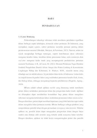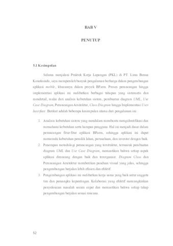 This report describes the Field Work Internship (PKL) conducted at PT. Lima Benua Koneksindo, specifically in the software department. The internship lasted two months and focused on the development of a mobile application called BFarm. This application was designed to improve efficiency in the land reservation and soil content checking process. Through the BFarm application, landowners can request land checks independently or through investor funding. The application design process involved various stages, from system requirements analysis and UML diagram creation, use case diagrams, architectural design, class diagrams, and user interface implementation. The project resulted in a functional and user-friendly mobile application, which is expected to provide significant benefits to landowners, companies, and investors. This experience provided valuable insights into mobile application development and enhanced understanding of work processes in the software industry.