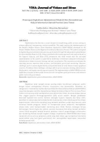 Digitalization has become a crucial element in transforming public services, aiming to enhance efficiency, transparency, and accountability. This study analyzes the implementation of the People's Welfare Bureau Grant Assistance Application (ABAH KESRA) developed by the People's Welfare Bureau of the Regional Secretariat of East Java Province. The system is designed to digitize the grant administration process, particularly through the independent upload feature for Accountability Reports (LPJ). Using a qualitative descriptive approach and analysis based on the Support, Capacity, and Value (SCV) framework, this study reveals that the successful implementation of the system is supported by leadership commitment, adequate technological infrastructure, human resource training, and user socialization. This innovation accelerates the reporting process, improves data accuracy, and facilitates grant fund monitoring. However, challenges such as uneven digital literacy and potential data security threats remain significant concerns. To address these challenges, strategic efforts such as intensive training, infrastructure development, and regular monitoring are essential. The implementation of ABAH KESRA not only fulfills the principles of ideal public service but also strengthens good governance and enhances public trust in the government.