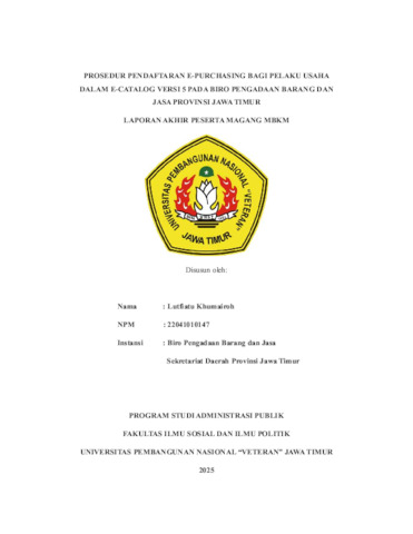 Khumairoh, Lutfiatu (2025) Prosedur Pendaftaran E-Purchasing Bagi Pelaku Usaha Dalam E-Catalog Versi 5 Pada Biro Pengadaan Barang dan Jasa Provinsi Jawa Timur. Project Report (Praktek Kerja Lapang dan Magang). Fakultas Ilmu Sosial, Budaya dan Politik, Surabaya. (Unpublished)