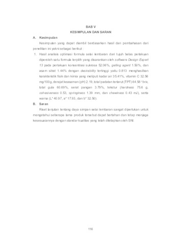 Selai lembaran merupakan modifikasi bentuk selai yang mulanya semi padat (agak cair) menjadi lembaran-lembaran sesuai dengan permukaan roti dengan tekstur kompak, plastis, dan tidak lengket. Keseimbangan konsentrasi sukrosa, pektin, asam, dan gelling agent akan mempengaruhi karakteristik mutu selai lembaran yang dihasilkan. Tujuan penelitian ini mencari formula optimum dari variasi konsentrasi sukrosa, gelling agent, dan asam sitrat pada selai lembaran berbasis buah pedada dan umbi bit menggunakan Response Surface Methodology (RSM) terhadap karakteristik fisik dan kimia. Metode penelitian menggunakan RSM D-Optimal Mixture Design dengan 3 faktor perlakuan yaitu konsentrasi sukrosa (51%-53%), gelling agent (1.5%-2.5%) dan asam sitrat (0.5%-1.5%) yang menghasilkan 17 kombinasi perlakuan (run). Hasil analisis diperoleh penambahan sukrosa, gelling agent dan asam sitrat berpengaruh signifikan terhadap respon kadar air, kadar vitamin C, derajat keasaman (pH), total padatan terlarut, total gula, dan tekstur (hardness, cohesiveness, springiness, chewiness). Formula optimum selai lembaran yang disarankan oleh Design Expert 13 yaitu konsentrasi sukrosa 52.06%, gelling agent 1.50% dan asam sitrat 1.44% dengan nilai desirability tertinggi 0.813. Hasil pengujian fisik dan kimia selai lembaran optimum meliputi kadar air 35.41%, kadar vitamin C 32.56mg/100g, derajat keasaman (pH) 2.19, total padatan terlarut 64.58obrix, total gula 60.69%, serat pangan 3.79%, tekstur (hardness 75.6g, cohesiveness 0.53, springiness 1.39mm, chewiness 0.43mJ), dan warna (L* 40.97, a* 17.97, b* 32.50). Kata kunci: Optimasi, Selai Lembaran, Respon Surface Methodology (RSM), D-Optimal Mixture Design