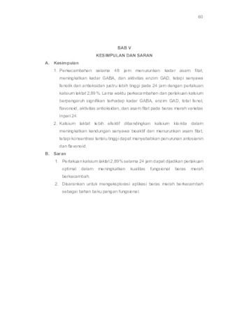 Beras merah pecah kulit yang dikecambahkan dalam interval waktu tertentu dan diberi perlakuan kalsium dapat menghasilkan produk pangan fungsional. Peranannya sebagai pangan fungsional dapat dilihat dari komponen bioaktif dan aktivitas antioksidannya yang berpotensi menjadi penangkal radikal bebas sehingga dapat mencegah penyakit degeneratif. Pembentukan komponen bioaktif dari beras pecah kulit berkecambah dapat dimaksimalkan dengan cara memperbaiki metode perkecambahannya. Penelitian ini mengkaji pengaruh metode perkecambahan parsial dan perlakuan stres kalsium terhadap peningkatan kandungan senyawa fungsional pada beras merah pecah kulit. Metode sirkulasi parsial dilakukan melalui perkecambahan dengan larutan kalsium klorida (CaCl2) dan kalsium laktat (C6H10CaO6) secara berkala selama 24 dan 48 jam. Hasil dari penelitian ini menunjukkan bahwa waktu perkecambahan dan perlakuan kalsium terbukti meningkatkan komponen bioaktif seperti GABA, total fenol, flavonoid, aktivitas antioksidan, serta penurunan asam fitat pada beras merah varietas Inpari 24. Secara umum, perkecambahan selama 48 jam mampu meningkatkan kadar GABA dan aktivitas enzim GAD, tetapi senyawa fenolik dan kapasitas antioksidan justru mencapai nilai tertinggi pada lama perkecambahan 24 jam, khususnya saat diberikan perlakuan kalsium laktat dengan konsentrasi 2,89%. Kalsium laktat menunjukkan efektivitas yang lebih tinggi dalam meningkatkan kandungan senyawa bioaktif dan menekan kadar asam fitat dibandingkan dengan kalsium klorida. Penggunaan kalsium laktat pada konsentrasi yang terlalu tinggi dapat berdampak negatif dalam penelitian ini karena menurunkan kadar antosianin dan flavonoid. Kata kunci : Beras merah, Fitokimia, GABA, Kalsium, Perkecambahan