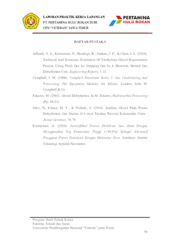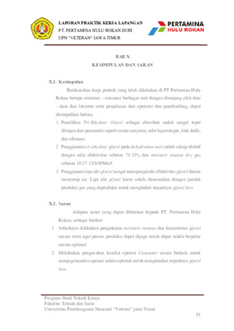 Praktek Kerja Lapangan (PKL) di PT Pertamina Hulu Rokan sebagai mahasiswa Teknik Kimia dilaksanakan di bagian Gas Plant, dengan fokus pada analisis efektivitas penggunaan Triethylene Glycol (TEG) di Dehydration Unit Gas Plant X. TEG digunakan untuk menghilangkan kandungan air dalam gas alam guna mencegah masalah korosi dan pembentukan hidrat. Namun, hasil analisis menunjukkan bahwa efektivitas penggunaan TEG di unit tersebut sangat rendah. Analisis dilakukan secara teoritis dan simulasi menggunakan software Aspen Hysys untuk mengevaluasi kinerja proses dehidrasi. Parameter yang diamati meliputi kadar air dalam gas keluaran, konsentrasi TEG, serta kondisi operasi seperti temperatur dan tekanan regenerasi. Hasil simulasi menunjukkan bahwa efisiensi absorpsi TEG tidak optimal, diduga disebabkan oleh kondisi operasi yang tidak sesuai, degradasi TEG, atau kontaminasi. Berdasarkan analisis ini, diperlukan evaluasi ulang terhadap proses regenerasi TEG, pemantauan kualitas TEG, serta optimasi parameter operasi untuk meningkatkan efektivitas dehidrasi. Rekomendasi perbaikan dapat mencakup peningkatan suhu regenerasi, pemurnian TEG, atau penyesuaian laju sirkulasi TEG.