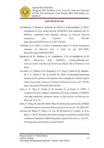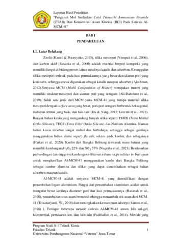 Putri, Alisyah Ananda (2025) PENGARUH MOL SURFAKTAN CETYL TRIMETYHL AMMONIUM BROMIDE (CTAB) DAN KONSENTRASI ASAM KLORIDA (HCl) PADA SINTESIS Al-MCM-41. Undergraduate thesis, UPN "VETERAN" JAWA TIMUR.