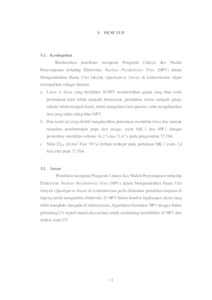 This research aims to analyze the effect of length of exposure to sunlight and the type of storage container on the effectiveness of NPV in controlling Spodoptera litura. NPV isolates were exposed to direct sunlight for 1, 3, 6 hours in glass and plastic vial containers. The isolate was infected to 3rd instar S. litura larvae using feed contamination technique. This research implemented a factorial Completely Randomized Design (CRD), with 6 treatments and control. The results showed that NPV isolates with MK.1 and MP.1 treatments were effective in producing a percentage of larvae mortality and were able to suppress the formation of pupae and imago with a mortality percentage of 84,2 % and 71,4 % at 72 hours after aplication. The best LT_50 value is found in the MK.1 treatment, which is 2.4 days or at 72 hours after application.