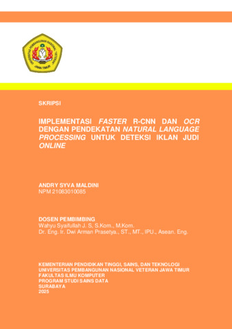 Maldini, Andry Syva (2025) IMPLEMENTASI FASTER R-CNN DAN OCR DENGAN PENDEKATAN NATURAL LANGUAGE PROCESSING UNTUK DETEKSI IKLAN JUDI ONLINE. Undergraduate thesis, Universitas Pembangunan Nasional Veteran Jawa Timur.