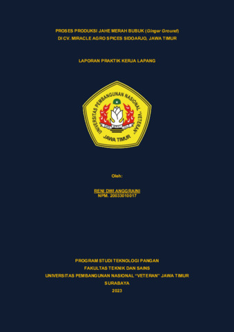 Anggraini, Reni Dwi (2025) Proses Produksi Jahe Merah Bubuk (Ginger Ground) di CV. Miracle Agro Spices Sidoarjo, Jawa Timur. Project Report (Praktek Kerja Lapang dan Magang). UPN Veteran Jawa Timur. (Unpublished)