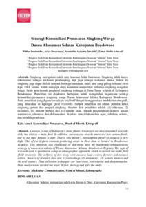 Singkong merupakan salah satu tanaman lokal Indonesia. Singkong tidak hanya dikonsumsi sebagai makanan pendamping, tapi juga sebagai makanan utama. Selain itu singkong juga dapat diolah menjadi berbagai makanan, salah satu yang paling terkenal yaitu tape. Oleh karena itulah mengapa daya konsumsi masyarakat terhadap singkong sangatlah tinggi. Salah satu daerah penghasil singkong tertinggi di Jawa Timur terletak di Kabupaten Bondowoso. Penelitian ini dilakukan bertujuan untuk mengetahui bagaimana strategi komunikasi pemasaran singkong warga Dusun Alassumur Selatan Kabupaten Bondowoso. Jenis penelitian yang digunakan adalah kualitatif dengan menggunakan pendekatan etnografi, yang dilakukan di lapangan (field research). Subjek penelitian ini adalah pemilik lahan singkong, petani dan penjual singkong. Sumber data penelitian adalah: (1) rekaman, (2) dokumen, (3) sumber tertulis dan (4) sumber lisan. Teknik pengumpulan datanya adalah wawancara, observasi dan dokumentasi. Analisis data dilaksanakan sejak, sebelum, selama, dan sesudah penelitian.