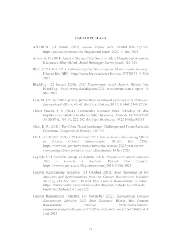 Seiring meningkatnya insiden serangan ransomware pada tahun 2021 di AS, pemerintah menyadari bahwa ransomware tidak dapat ditangani secara unilateral atau oleh negara sendiri. Diperlukan kerja sama multilateral yang secara khusus menangani ancaman ransomware karena melihat sifat serangan yang lintas batas negara serta mampu mengganggu stabilitas dan keamanan negara melalui serangan terhadap infrastruktur penting negara. Hal ini mendasari AS membentuk Counter Ransomware Initiative (CRI) sebagai bentuk kerja sama multilateral dalam melawan ancaman ransomware global. Penelitian ini menjelaskan bagaimana AS mengimplementasikan kerja sama siber melalui CRI dalam merespons ancaman ransomware yang bersifat lintas negara. Metode penelitian ini yaitu kualitatif-deskriptif yang akan membantu penulis dalam menjelaskan apa saja langkah yang dilakukan oleh AS dalam melakukan kerja sama melalui CRI. Penulis juga menggunakan teori ancaman siber dan kerja sama siber. Data diperoleh dari studi pustaka melalui dokumen resmi, laporan resmi, artikel, media, dan sumber lain yang kredibel dan relevan dengan topik penelitian. Hasil penelitian menunjukkan bahwa implementasi kerja sama siber AS melalui CRI tahun 2021-2024 dilakukan melalui lima indikator, yaitu kepastian hukum, struktur organisasi, tindakan prosedural, capacity building, dan kerja sama internasional. AS berkontribusi aktif dalam penguatan norma, pertukaran informasi, pelatihan, serta kolaborasi lintas sektor dalam menghadapi ancaman ransomware.