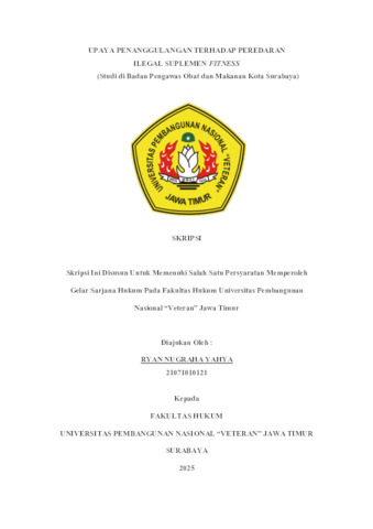 Yahya, Ryan Nugraha (2025) UPAYA PENANGGULANGAN TERHADAP PEREDARAN ILEGAL SUPLEMEN FITNESS (Studi di Badan Pengawas Obat dan Makanan Kota Surabaya). Undergraduate thesis, UPN Veteran Jawa Timur.