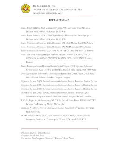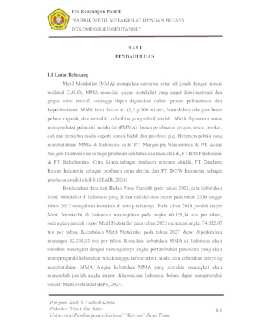 WIBISANA, RANGGA PUTRA ADJI (2025) PRA RENCANA PABRIK METIL METAKRILAT DENGAN PROSES DEKOMPOSISI ISOBUTANOL DENGAN KAPASITAS 60.000 TON/TAHUN. Undergraduate thesis, UIVERSITAS PEMBANGUNAN NASIONAL "VETERAN" JAWA TIMUR.